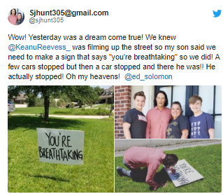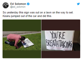 Про цю історію в Twitter- аккаунті написав сценарист "Біла і Теда 3" Ед Соломон. "Учора на газоні по дорозі на зйомки був цей знак. Кіану вискочив з машини і зробив ось це", - написав Соломон під двома фотографіями.