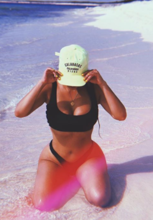 На одному з фото Кардашьян позує в червоному бікіні на матраці, на іншому - в чорному роздільному купальнику з широким топом.