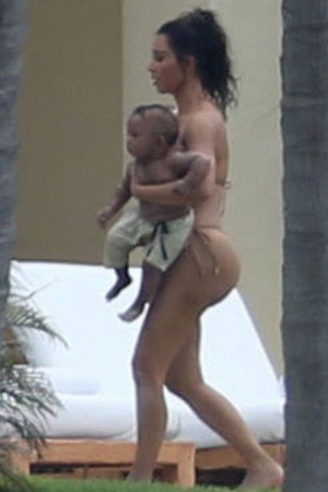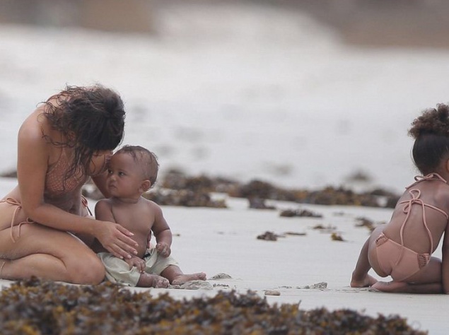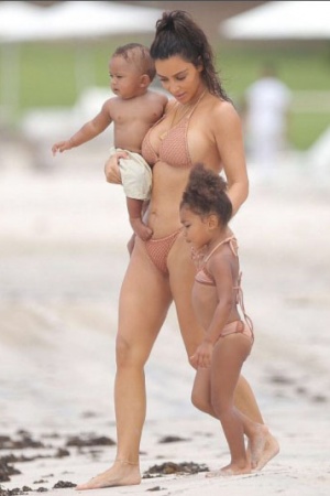 Папараці зняли Кім Кардашьян під час сімейного відпочинку. Зірка реаліті-шоу була одягнена в роздільний бежевий купальник і грала зі своїми дітьми – трирічною Норт і восьмимісячним Сейнтом.