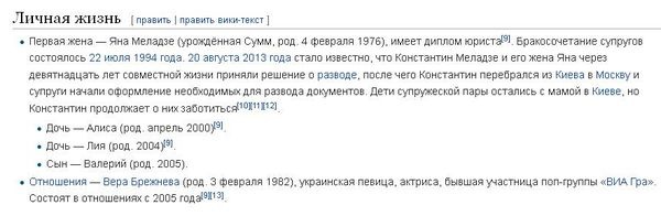 Однак, у "Вікіпедії" Віри Брежнєвої згадок про роман з Костянтином Меладзе відомостей немає.