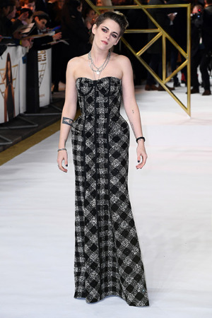 Для червоної доріжки зірка вибрала ефектний аутфіт. Актриса одягнулася в картату сукню з відкритими плечима від Thom Browne. Вечірній образ Крістен доповнила чорно-білими кросівками.