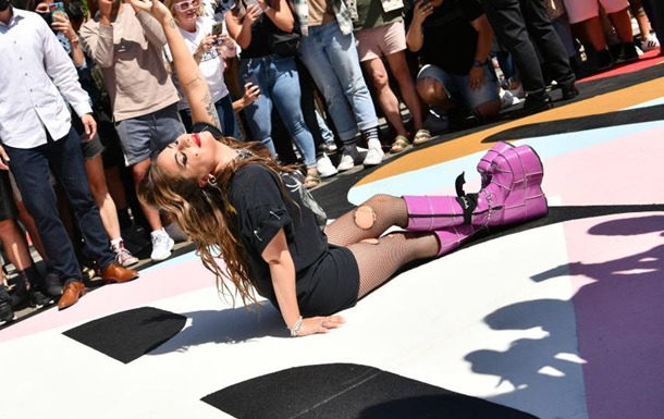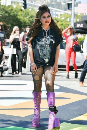 Для урочистої церемонії зірка вибрала епатажний образ: одягнула чорні колготки в сітку з великими дірками, фіолетові лаковані чоботи на великій платформі і чорну футболку, яку спереду зав'язала на вузол. Наряд доповнили масивні прикраси.