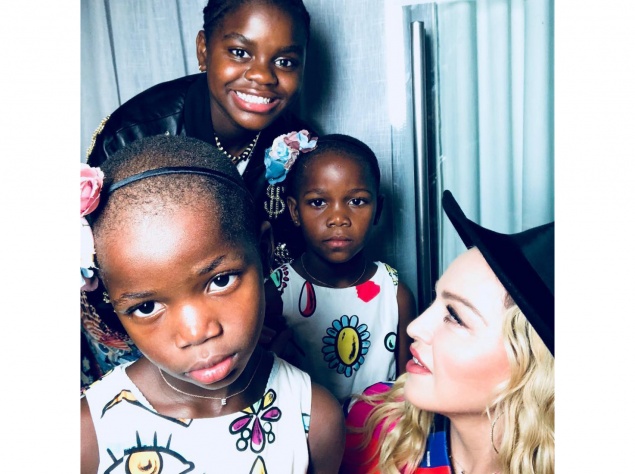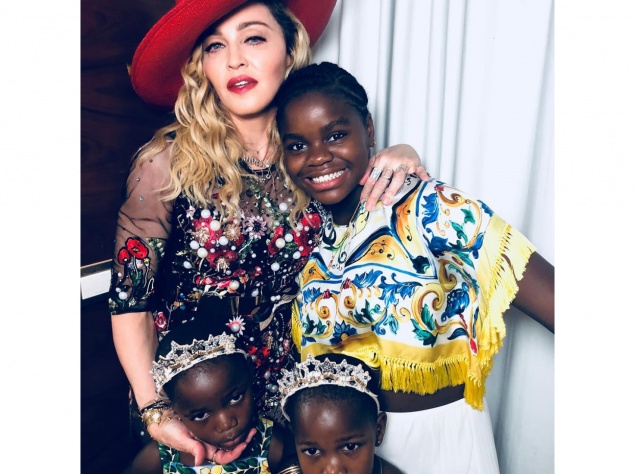 Дітей Мадонна також одягла дуже строкато. На фото поп-королева зображена зі своїми дочками - Мерсі Джеймс і близнючками Естер і Стелою. Старшу доньку Мадонна удочерила ще в 2009 році, а молодших - взимку поточного року.