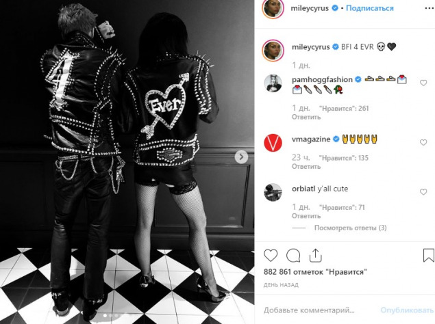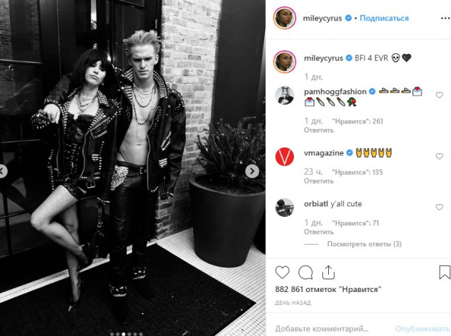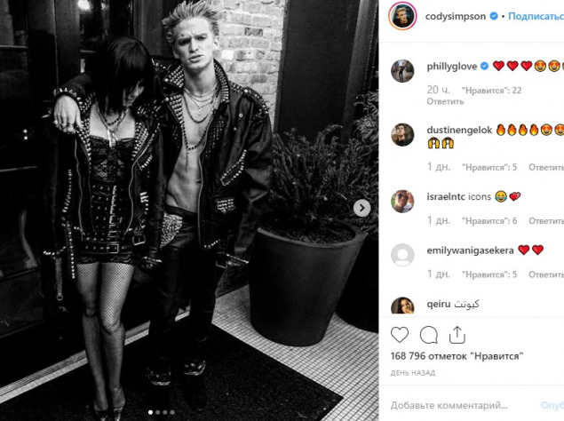 На своїх сторінках в Instagram Майлі і Коді опублікували чорно-білі фото і відео. Своїм фоловерів селебріті пояснили, що на свято перевтілилися в Біллі Айдола і його колишню дружину Перрі Лістер.