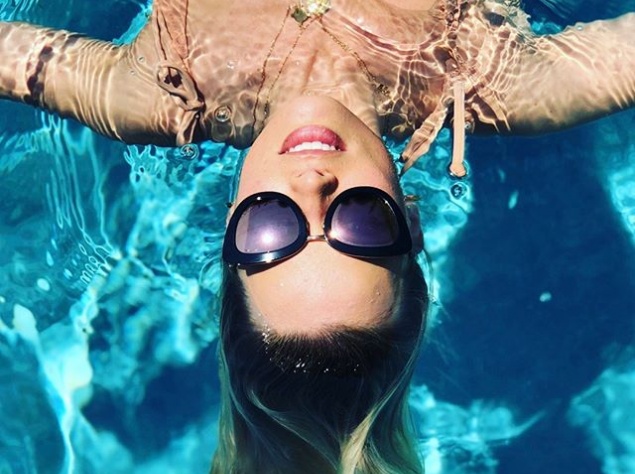Марго зафіксована у воді, тому її бежевий наряд повністю вологий. З аксесуарів на моделі тільки темні окуляри, що повністю приховують очі. В якості прикрас вибрані невеликі золоті сережки і ланцюжок з квадратними підвісками.