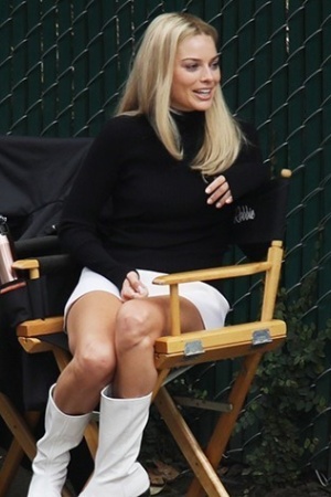Цього разу зірка знімалася вже без накладного живота: на ній була чорна водолазка, біла міні-спідниця і чоботи в тон. Образ в стилі ретро був доповнений нюдовым макіяжем і укладанням - випрямленим волоссям, кінці якого були захворіла скручені. До речі, в цьому луку Робби вже з'являлася на знімальному майданчику кілька місяців тому.