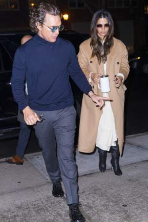 Актор надів синю водолазку і темно-сірі брюки, образ він завершив сріблястими окулярами-авіаторами і чорними шкіряними оксфордами, пише storinka.com.ua. Його дружина віддала перевагу білому светру, спідниці молочного відтінку, теплому пальту пісочного кольору і темні ботильоны на каблуці.