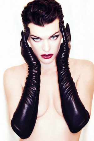 На деяких знімках Мілла в довгих латексних рукавичках прикриває руками голі груди.