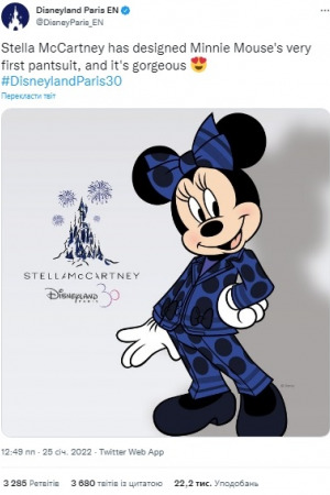 "Стелла Маккартні розробила перший брючний костюм Мінні Маус, і він чудовий", - йдеться в офіційному Twitter-акаунті парку.