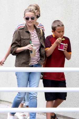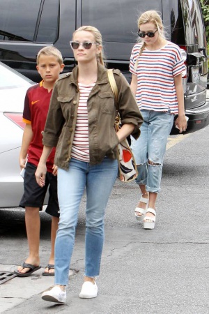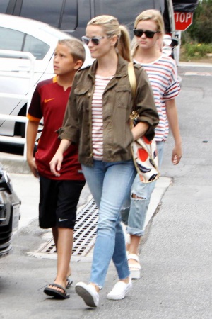Папараці зняли Різ з дочкою Аве і сином Діконом під час прогулянки в Лос-Анджелесі. До речі, для появи на публіці з дітьми Візерспун вибрала досить простий одяг: джинси, топ у смужку і легку куртку.