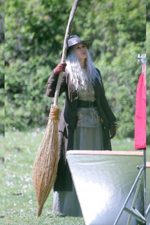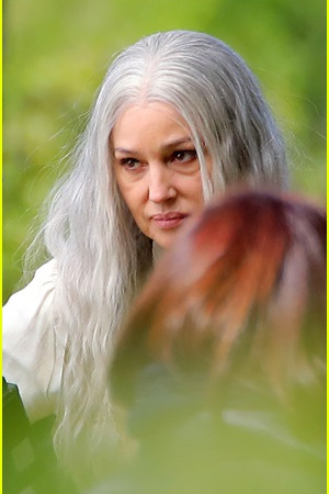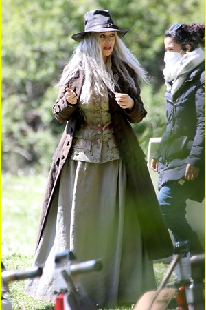 На атмосферних знімках Моніка в сивій перуці із зачіскою відьми і вбранні в стилі ретро - довгій спідниці, плащі, жакеті з ременем. Аутфіт відьми Белуччі доповнила мітлою і капелюхом.