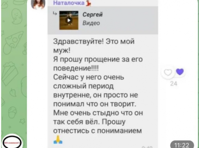 Відео зі скандалом і вибачення дружини опублікував в Facebook "Київ Оперативний". Денисенко в коментарях під роликом попросила вибачення за його поведінку.
