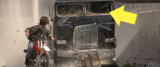 Вантажівка, за кермом якого сидів Т-1000, перекидається на мосту, і у нього вилітає лобове скло. На наступному кадрі видно, що скло знову на місці.