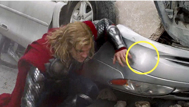 "Месники". В одній зі сцен Тор розносить все в окрузі, в тому числі і одну з машин, бампер якої в наступному кадрі чудесним чином самовідновлюється.