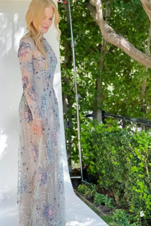 Кідман обрала для себе розкішну напівпрозору сукню максі з колекції Giorgio Armani Privé весна-літо 2021, розшиту квітами з бісеру. Вбрання ідеально сиділо на стрункій фігурі зірки.