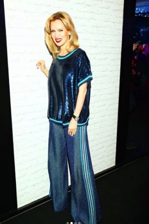 Для виходу у світ Судзіловська вибрала стильний аутфіт синього кольору. Зірка одягнулася у брюки з лампасами і топ вільного крою, розшитий паєтками.