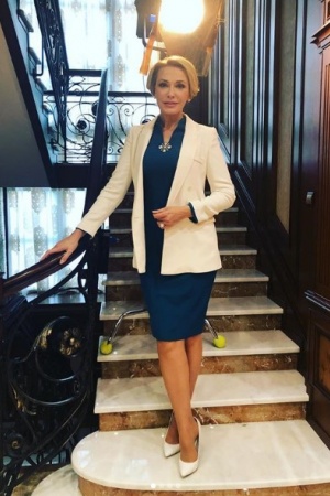 На опублікованому знімку Ольга зафіксована в жіночному наряді. Синя сукня-футляр зірка доповнила білими туфлями-жакетом в тон і брошкою.
