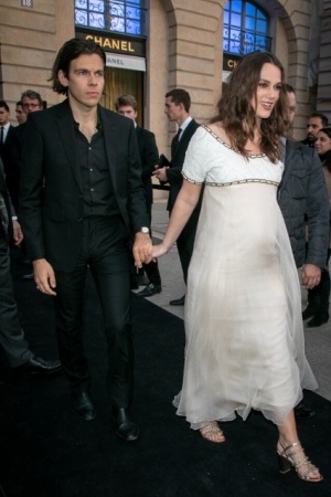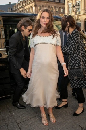34-річна Кіра Найтлі і її чоловік, Джеймс Райтон чекають другу дитину. Вчора актриса продемонструвала живіт на вечірці Chanel J12 в Парижі. Для свого виходу зірка вибрала напівпрозору сукню кремового кольору і золотистих босоніжок. Кіру супроводжував чоловік, вони трималися за руки, коли йшли по Вандомській площі.