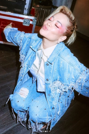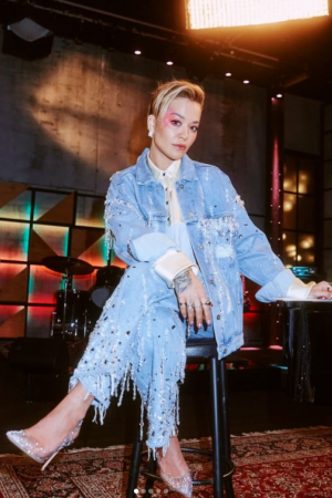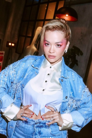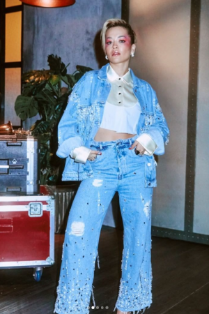 Ріта Ора стала однією з тренерів шоу The Voice Australia, тому часто останнім часом ділиться цікавими вбраннями, які підбирають для неї стилісти. На одному з фото опублікованих Ритою в Instagram, вона була одягнена в комплект з деніму, який був розшитий великим камінням.