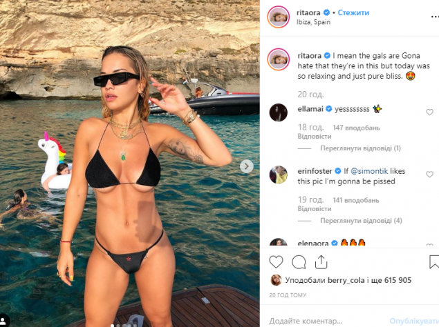 Разом з друзями Ора відпочиває на іспанському острові Ібіца. Там, під час прогулянки на яхті, дівчина зробила декілька фото в дуже відвертому купальнику.