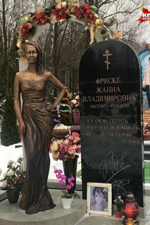 Кілька днів тому на Ніколо-Архангельському кладовищі, з'явився пам'ятник Жанні Фріске. Скульптура співачки в повний зріст мало кому видалася схожою на артистку, про що люди почали писати і на своїх сторінках у соціальній мережі. "Зовсім не схожа", "Інша особа.. взагалі не схожа", "Як-то старо Жанна виглядає тут.. вибачте, зовсім не те" — писали шанувальники Фріске. Наталя, молодша сестра померлої, відповіла незадоволеним фанатам. "Друзі мої, по-перше, фото завжди спотворює...по-друге бронза ніколи не передасть 100 % схожості.... по-третє, всі звикли бачити Її з посмішкою, макіяжем і т. д..... коли побачите в живу, зрозумієте що схожа.." — написала Наталя. Нагадаємо, що Жанна померла від раку головного мозку в червні минулого року. У неї залишився син Платон, який зараз живе з колишнім цивільним чоловіком артистки Дмитром Шепелєвим і є яблучком розбрату між ним і батьками покійниці.