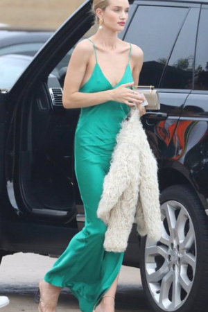 "Ангел" Victoria's Secret виглядала бездоганно у безпрограшному для романтичного вечора шовковому сукні-комбінації. Нотку пікантності в образ внесла відсутність бюстгальтера. Богемний look завершила шубка, босоніжки від популярного бренду Jacquemus і клатч.