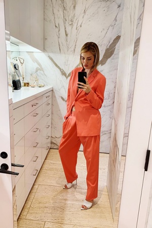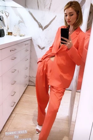 Обновку Роузі продемонструвала у своєму Instagram, опублікувавши відразу декілька знімків в комплекті з коралових брюк і блейзера від бренду BCBG Max Azria. Піджак, модель наділа на голе тіло, доповнивши образ білими мюли бренду Gianvito Rossi (їх ми вже неодноразово бачили в інших модних look 'ах зірки) і блиском на губах трохи ніжніше за відтінок самого костюма.