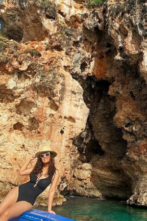 Після цього Сальма Гаєк не припиняє дивувати громадськість, публікуючи ефектні фото з відпочинку. На одному з кадрів акторка постала перед камерами у чорному закритому купальнику від бренду Alexander McQueen. Сальма Гаєк залюбки позувала на фоні скелі та приховала інформацію про місце, де наразі відпочиває. Ймовірно, зірка обрала узбережжя Середземного моря, де часто влаштовує собі відпустку.