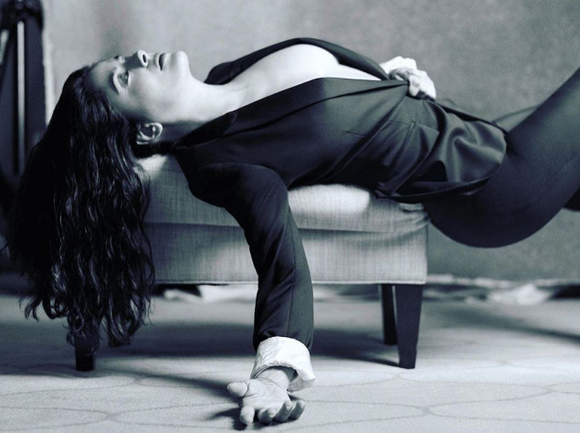 На актрисі чорний жакет, надітий на голе тіло, і чорні обтягуючі брюки.