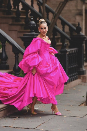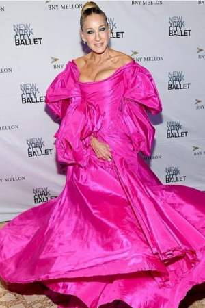 Папрарацці знали про присутність Сари Джесіки Паркер на події, тому чекали її виходу ще у сходів будинку. Перед камерами фотоапаратів актриса з'явилася в приголомшливій пишній сукні з шлейфом від Zac Posen. Не побоявшись надмірної яскравості і помпезності, зірка Голлівуду вибрала відтінок фуксії, який привертає ще більше уваги.