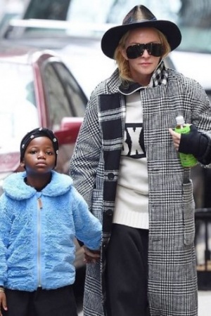 58-річна піп-ікона була одягнена в модне картате пальто довжини міді, широкополий капелюх, білий пуловер, а також стильні брюки. Не відставали від знаменитої мами і прийомні дочки Мадонни. Дівчатка наділи темні міні спідниці, штучні короткі шуби блакитного кольору, а також стильні хустки, які малятка пов'язали на голови.
