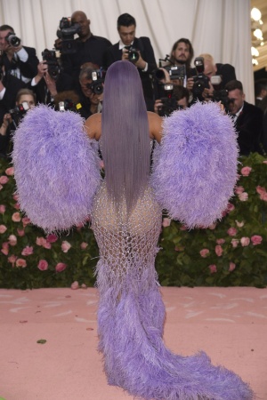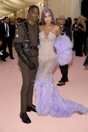 Молодша сестра Кім Кайлі Дженнер з'явилася на Met Gala в розкішній фіалковій сукні-сітці в підлогу Versace, яка була доповнена пір'ям. Під колір сукні зірка обрала і відповідну перуку.