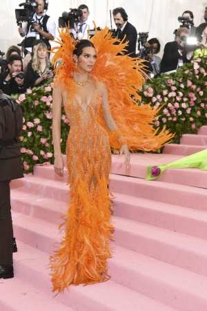 Сестра Кім і Кайлі, 23-річна модель Кендалл Дженнер, з'явилася на балу в помаранчевій напівпрозорій сукні з пір'ям.