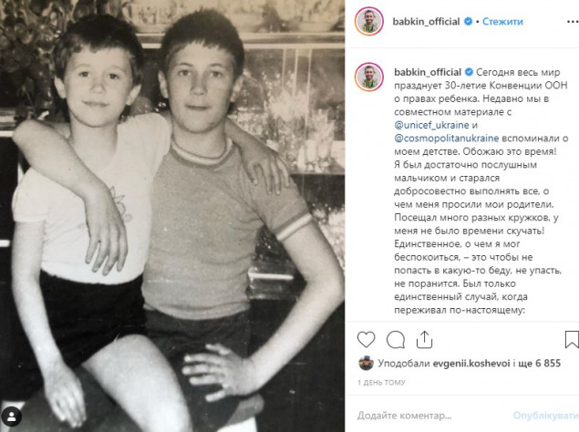 "Обожнюю цей час! Я був досить слухняним хлопчиком і намагався сумлінно виконувати все, про що мене просили мої батьки. Відвідував багато різних гуртків, у мене не було часу нудьгувати! Єдине, про що я міг турбуватися, - це щоб не потрапити в якусь біду, не впасти, не поранитися. Був тільки єдиний випадок, коли переживав по-справжньому: одного разу нас з братом упіймали на будівництві і пригрозили, що зараз відведуть в міліцію! Тоді я дуже злякався реакції батьків, того, що вони дізнаються. Цей момент пам'ятаю досі", поділився артист в посту з фото.