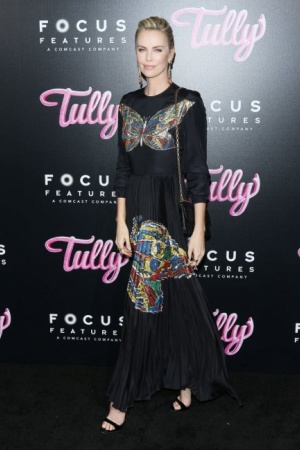 Терон стала справжньою прикрасою вечора. На захід, присвячений прем'єрі "Талли" Шарлиз прийшла в довгій чорній сукні Christian Dior з яскравим принтом у вигляді величезних метеликів. Образ зірка доповнила чорними босоніжками і сумочкою на ланцюзі в тон наряду.