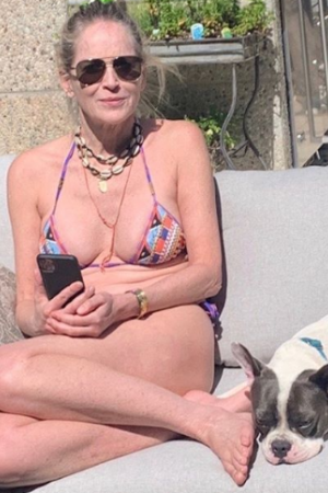 На одній фотографії Шерон Стоун позувала в різнобарвному купальнику біля басейну на території приватного будинку. Поруч з акторкою також стояв її пес, а в басейні плавали друзі. На голову зірка одягнула шолом "Гладіатора".