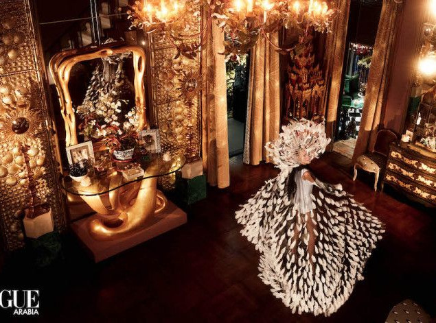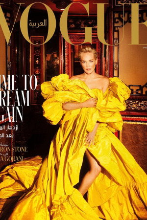 Цю традицію зірка фільму "Основний інстинкт" продовжила вже на сторінках арабського Vogue. 64-річна жінка позувала для обкладинки журналу в жовтій та синій сукнях.
