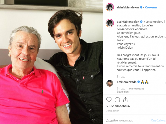 "Прогрес щодня. Ми не могли і мріяти про таке одужання. Він тепло дякує вам усім за підтримку, яку ви йому робите", - розповів Делон-молодший.