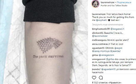 Малюнок доповнила цитата: "Зграя живе". Повністю фраза звучить наступним чином: "Коли випадає сніг і дмуть білі вітри, самотній вовк вмирає, але зграя живе". Фанати вже мріють, що репліка означає перемогу Старків і те, що Джон все-таки стане королем.