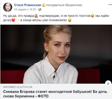 Радісною новиною знаменитість поділилася на своїй сторінці в Facebook. Ровінська повідомила, що чекає на появу дочки у кінці весни 2020 року.