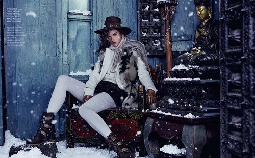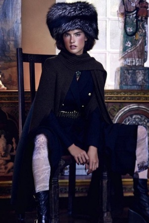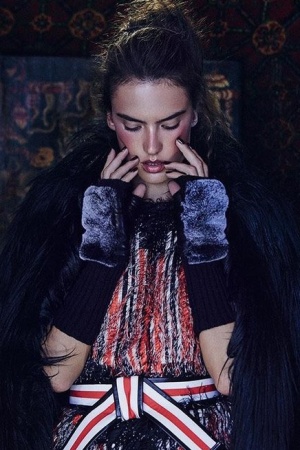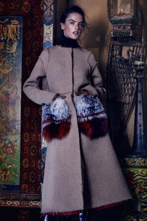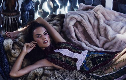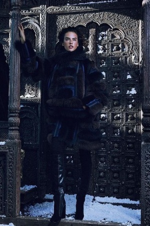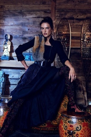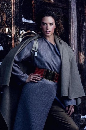 Цього разу стилісти підібрали Алессандро стильні зимові образи з етнічними мотивами. Бразильська супермодель позувала в теплих пальто, шубах і об'ємних хутряних шапках на тлі засніжених стін. Вона також приміряла кілька вечірніх нарядів.