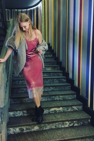 Ходченкова підкреслила струнку фігуру рожевою сукнею з мереживом від бренду A. G. P, яка нагадує нічну сорочку. Світлана доповнила образ теплим об'ємним кардиганом і чорними черевиками.