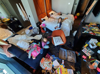 На курйозному кадрі видно, як 8-річна Те і 5-річна Матева влаштували розгардіяш у кімнаті. Дівчатка розкидали всі речі по підлозі та меблях, і в цьому хаосі залюбки продовжували гратись.