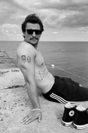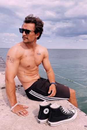 Популярний український актор Тарас Цимбалюк поділився з підписниками новими фотографіями в мережі Instagram. На знімках він сидить на морському узбережжі з оголеним торсом, а поруч стоять чорні кеди Converse.