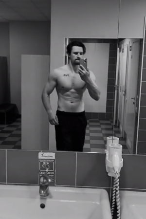 Так, 31-річна зірка "Кріпосної" на своїй сторінці в Instagram опублікував відео, зняте у роздягальні спортзалу, на якому продемонстрував свій оголений м'язистий торс.