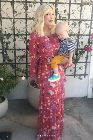 Актриса з'явилася перед камерами в червоній сукні з квітковим принтом і рюшами. Талію зірка вважала за краще підкреслити золотистим поясом. До речі, Торі сильно схуднула після пологів і тепер з радістю підкреслює струнку фігуру стильними нарядами.