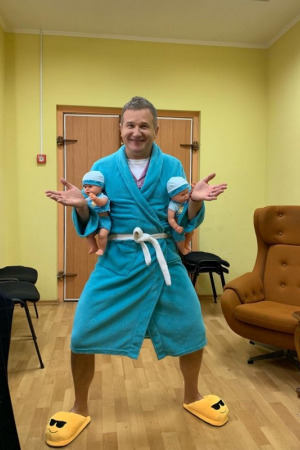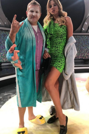Так, Юрій Горбунов опублікував яскраві фото зі зйомок програми "Хто проти блондинок". На деяких з них він зображений в піжамі, блакитному халаті і забавних жовтих домашніх тапочках. А веселився він в компанії Лесі Нікітюк, яка також є на фото.