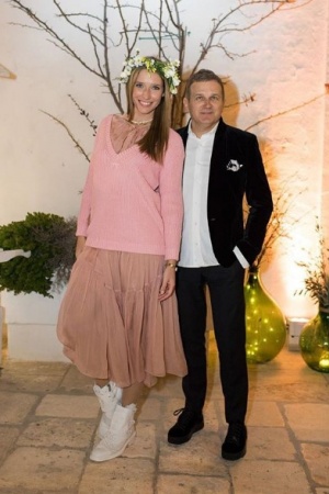 Цей пост телеведучий супроводжував своєю фотографією з дружиною Катериною Осадчою. На знімку Юрій зафіксований в чорному костюмі і білій сорочці, а Катя - в нюдовом сукні з фатина і ніжно-рожевому джемпері. Образ теледіви доповнюють білі черевики і вінок на голові.