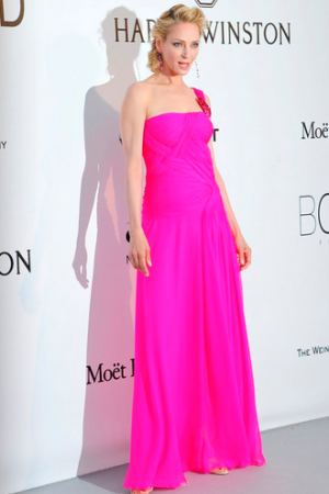 На заході Турман з'явилася в рожевій сукні з колекції Schiaparelli Haute Couture. Актриса виглядала по-справжньому розкішно і з задоволенням позувала фотографам. На вечірці зібралося безліч знаменитостей, починаючи з Хелен Міррен (Helen Mirren) і закінчуючи Іриною Шейк, але саме зірка "Кримінального чтива" виявилася яскравіше за всіх.