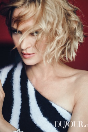 В рамках фотосесії для DuJour 47-річна Ума Турман приміряла елегантні наряди люксових брендів: Dolce & Gabbana, J. Mendel, Tom Ford і інші. Образ фатальної жінки для актриси створив французький стиліст Ізабель Дюпре.